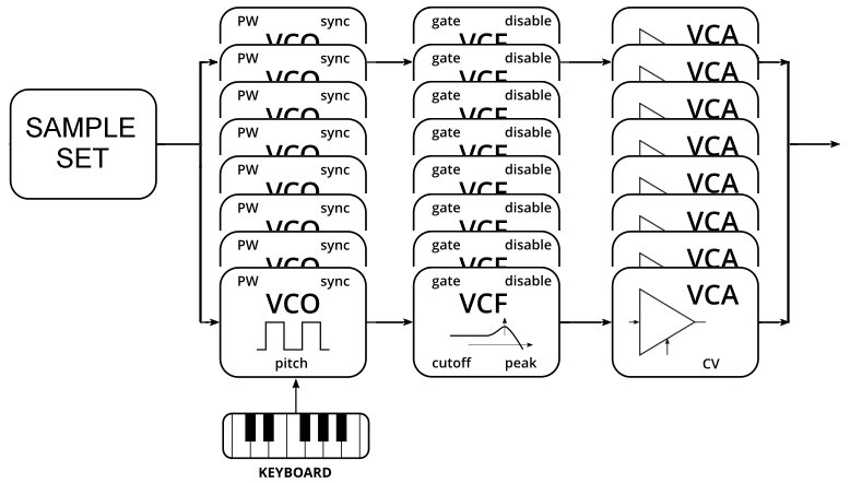 To create an advanced sample based synth, manufacturers like Yamaha increased the number of samples used to create a voice. You can overlay up to eight samples on the Motif and the Montage. Some samples are used just for the Attack portion of the voice, some are used to create the main voice, another can be mixed in to create a high velocity portion of the sound, and others can be used to handle the key release, or they can model anything else you can dream up. Besides the controls on each part, the block diagram remains pretty much the same as the one we started with, there are just eight parallel sets of components now that mix together. The newest Montage M line allows you to overlay 128 parallel sounds… I can’t for the life of me figure out why you would need that many.