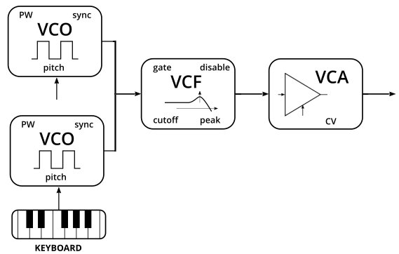 I’m just showing the basics below, not an entire block diagram. Envelopes and LFOs tap in here and there, along with several physical controllers like the foot pedals and mod wheels.