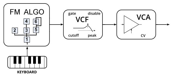 FM was really the first major departure from the standard model. FM replaces the VCOs with a block of digital Oscillators, VCAs and ENVs arranged in an Algorithm. Using one or two oscillators to modulate a carrier oscillator can create an enormous number of harmonics, which is enhanced by adding feedback onto one of the Operators. Most of the same basic components are here, but creating a sharp sawtooth, pulse wave or triangle wave takes some work. An FM synth can emulate a LOT of different sounds, far more than an Analog synth. Looking at the advanced, modern FM instruments starting with the Yamaha FS1R, Yamaha developed FMX which uses a set of very complex waveforms in addition to sine waves in the individual operators. This greatly expands the timbres possible on the instrument. The wavetable option actually started much earlier with the Yamaha DX11, a 4-Operator FM instrument.