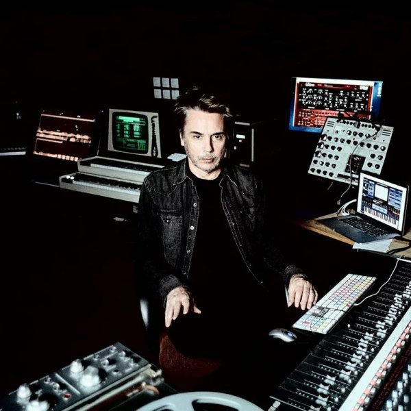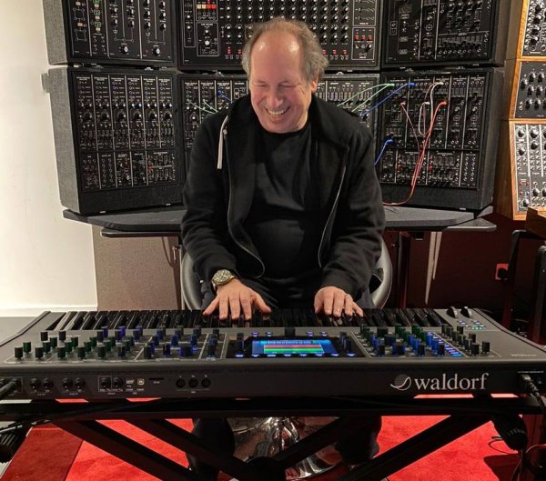 Hans Zimmer playing a Waldorf Quantum, with a Roland System 700 in the background.