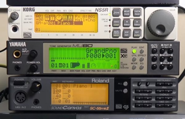 Tone Generators: Korg NS5R (1996), Yamaha MU80 (1994), Roland Sound Canvas SC-55mkII (1991)