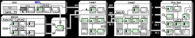 The Yamaha VL1 also adds a large number of new components onto the core modules. Most of these add-ons modify the ‘Driver’ waveform to mimic the mouthpiece, bow, or finger pluck of the instrument you’re trying to model. These add-ons are linked to controllers so the player can mimic acoustic instrument articulations as they perform. The Yamaha VP1 has none of these add-ons, it’s a more general acoustic modeling instrument which makes it a bit more difficult to program, but far easier to understand. You can see the internal block diagram for the Yamaha VP1 from the editor below, which really only shows one half of the model at a time. The VP1 models plucked or struck instruments, the VL1 models wind and string instruments.