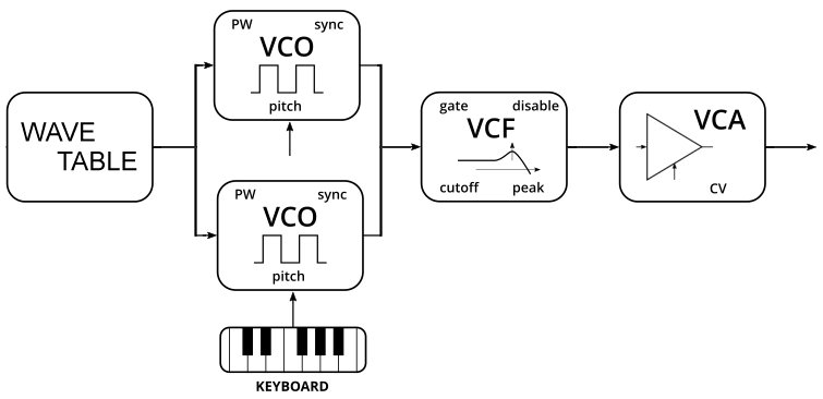 The Wavetable synths made a slight upgrade to the basic system, they expanded the number of waveforms from four up to 128 or so. A new block in the diagram is added on below. Vector synths allowed you to select four waveforms out of the wavetable which were then mixed based upon the position of the joystick. The diagram below shows just two VCOs.